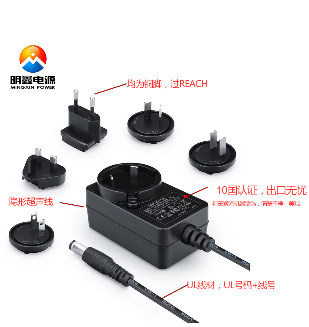 26V1A筋膜槍充電器UL1310 PSE BSMI CE GS KC KCC SAA DOE6級能效, 明鑫電源針對筋膜槍市場,投入了全球認證,全面升級產品外觀,性能,此款產品為高光鏡面,中間為一條高光絲帶狀結合線,每個角度都能解讀到它的與眾不同,最大做到27V1A,中,美,歐,日,臺灣,韓,日本各個市場都能滿足。
